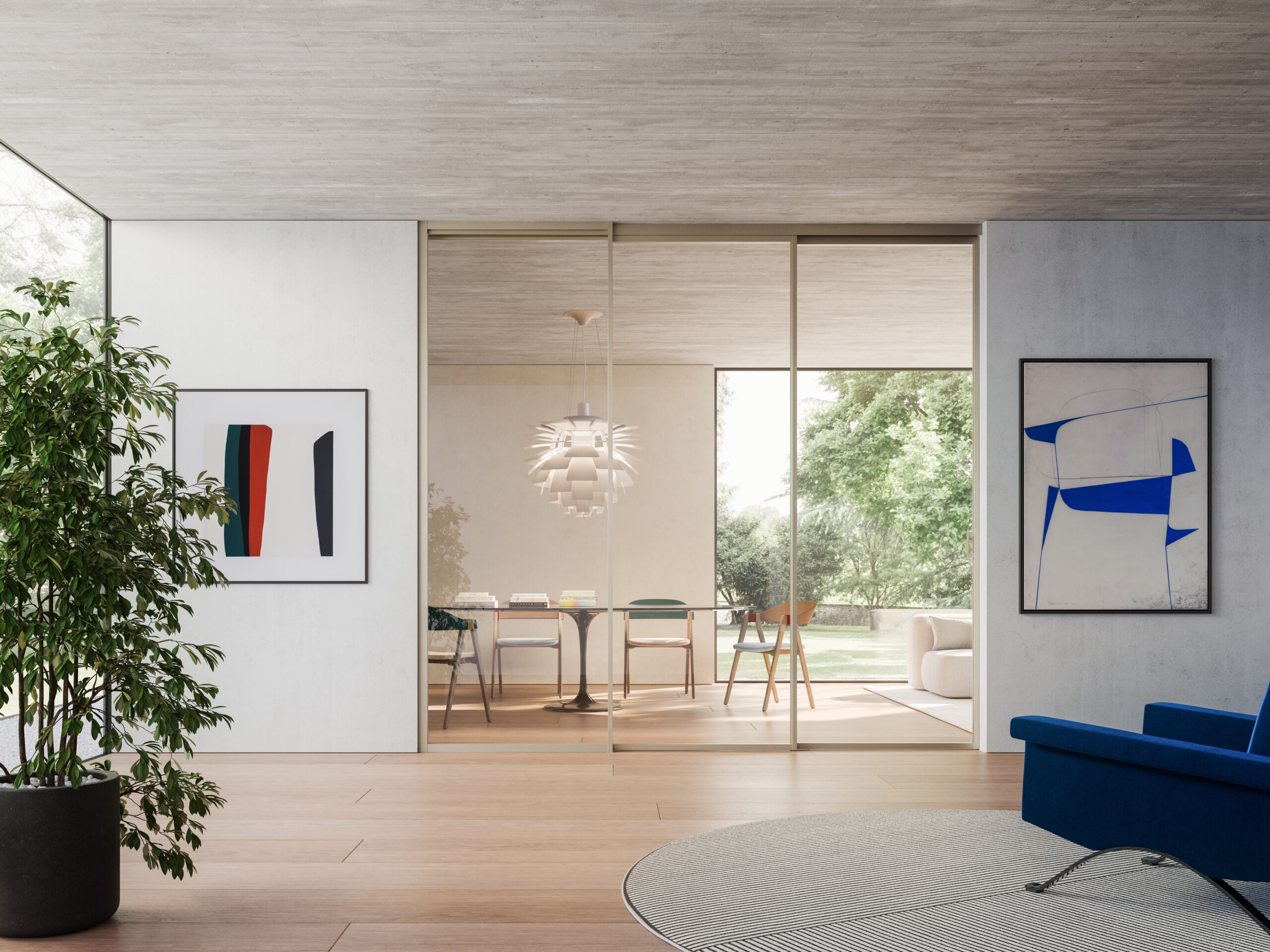 Die Kollektion LM INTELAIATO ist das neue Schiebetürsystem aus Aluminium in der Produktfamilie von Logli. Es kann mit Einzelglas in 8 mm Stärke oder Verbundglas 4 + 4 mm eingebaut werden, die von einem Strukturrahmen aus Aluminium umrahmt sind.